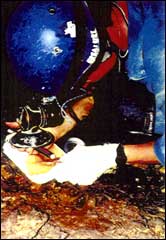 Jean Krejca, Univ. of Texas marking blind cave fish with BMX1000 PEN-JECT (Courtesy of J. Krejca)
